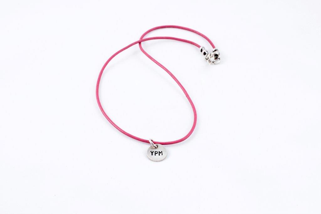 Sterling 1/2″ charm hand-stamped with YPM on single strand of dark pink smooth leather. 16″ length.