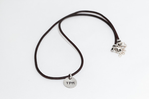 Sterling 1/2″ charm hand-stamped with YPM on single strand of brown smooth leather. 16″ length.